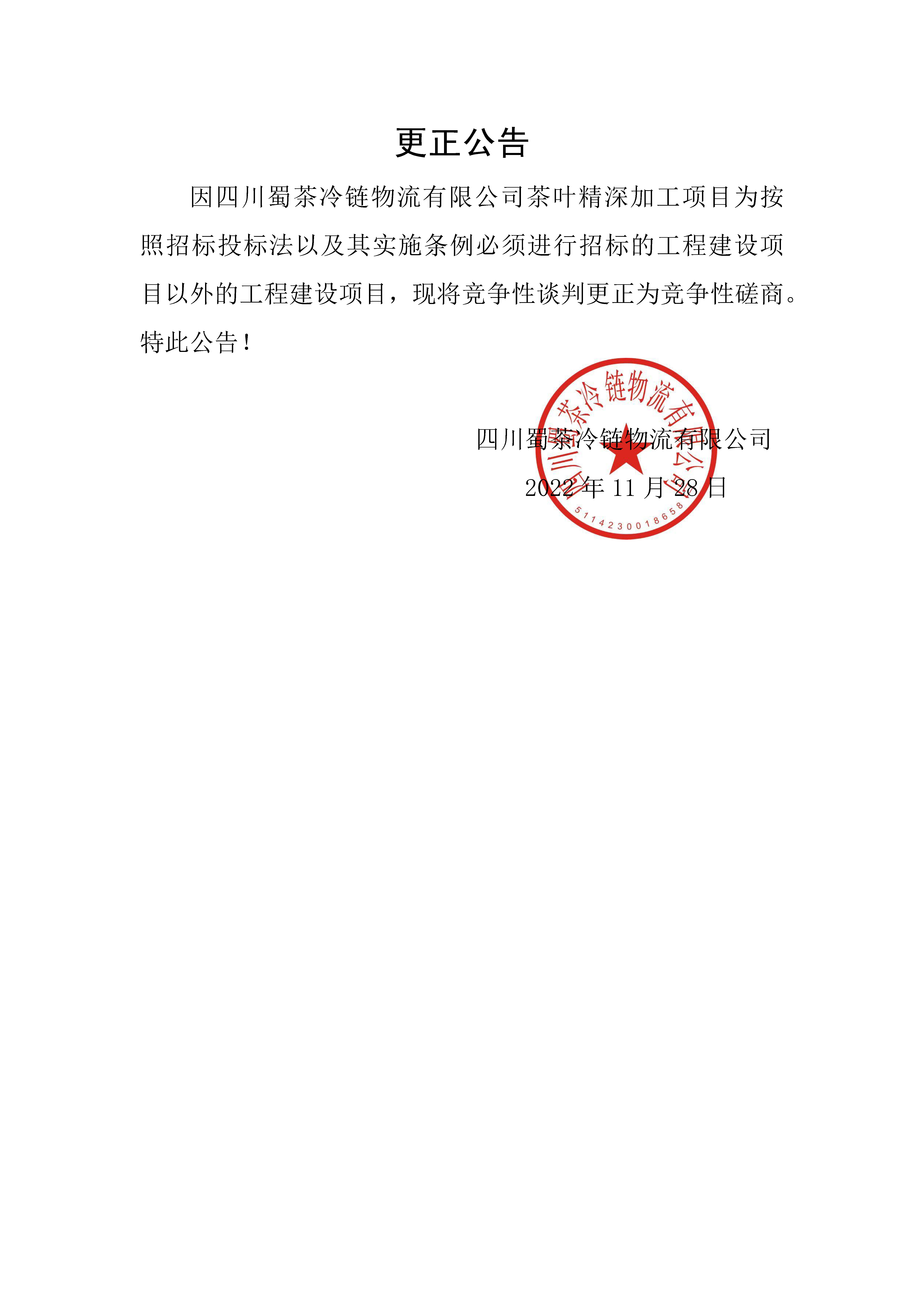 四川蜀茶冷鏈物流有限公司茶葉精深加工項(xiàng)目更正公告