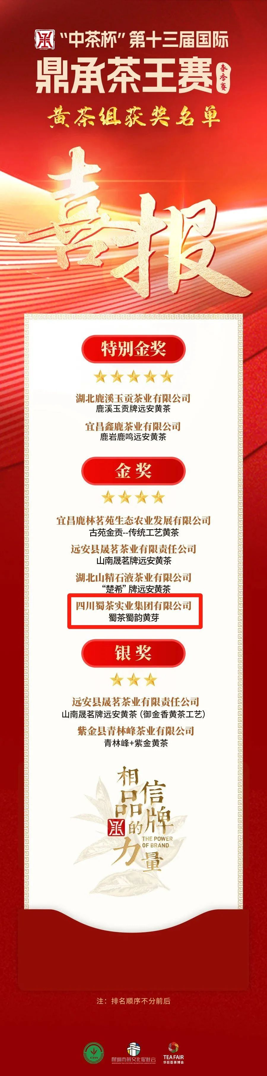 6月28日,在浙江省杭州市中國茶葉學(xué)會(huì)隆重舉辦的“中茶杯”第十三屆國際鼎承茶王賽(春季賽)獲獎(jiǎng)名單出爐,經(jīng)過激烈角逐,蜀茶集團(tuán)“蜀韻黃芽”斬獲大賽黃茶組金獎(jiǎng)獎(jiǎng)項(xiàng)。