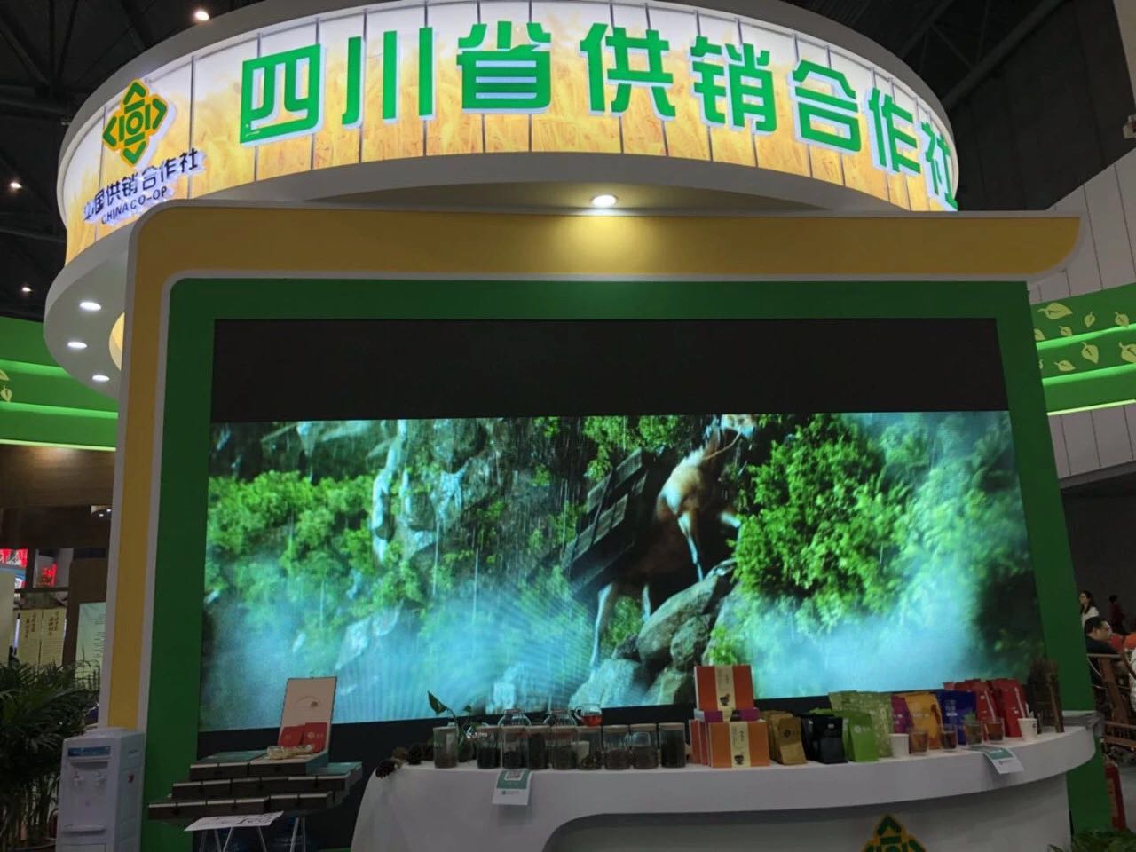 在中國西部國際博覽城主要展示川酒、川菜、川茶、川果、川藥、川豬、川煙、川油等四川農(nóng)業(yè)金字招牌產(chǎn)品的14號展區(qū)——農(nóng)產(chǎn)品精品展區(qū)內(nèi),四川省供銷社以象征自然農(nóng)業(yè)的綠色、象征收獲與輝煌的金色、象征希望的白色為主題色調(diào)布置的展館,立體全面地向中外客商展示展銷優(yōu)質(zhì)農(nóng)產(chǎn)品,吸引了中外嘉賓客商駐足參觀。展館前方中央處以上圓下方的理念設(shè)計而成,“上圓”是一個做成圓環(huán)形狀的天頂,“下方”為一塊方形的LED大屏幕,寓意“天圓地方”,展館后側(cè)為弧形造型墻體,象征融合與開放。