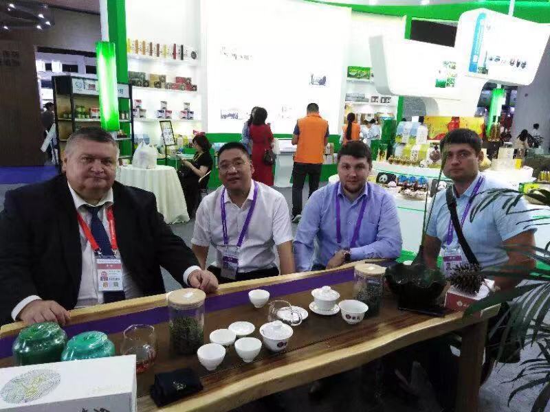 蜀茶總經(jīng)理廖哲與外國參展客商交流業(yè)務(wù)