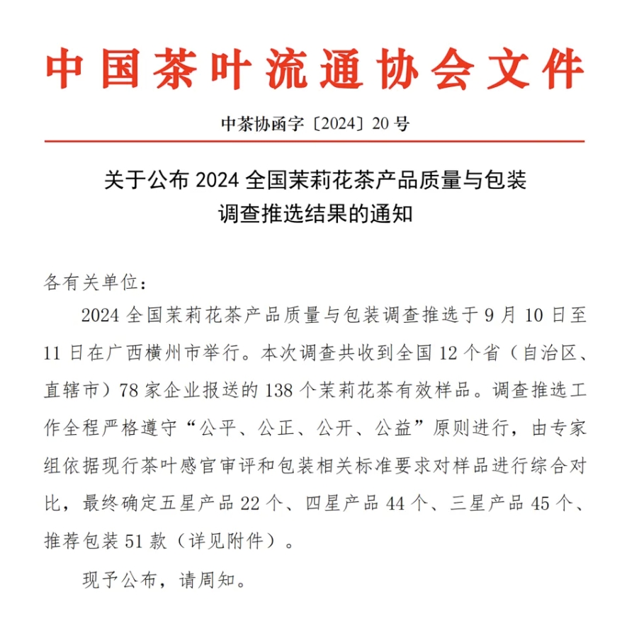 9月19日,由中國茶葉流通協會主辦的《2024年茉莉花茶產品質量與包裝調查推選》結果公布,蜀茶集團選送的“蜀韻·清新飄雪”茉莉花茶榮獲“四星產品”、“蜀曉晨露·茉莉銀針”獲評“三星產品”。除此之外,“蜀曉晨露·茉莉銀針”還同時獲得“推薦包裝”獎!